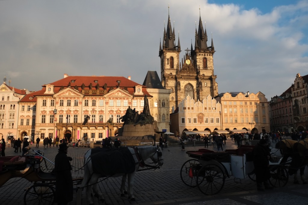 Old Town Square (Staroměstské náměstí) is surrounded by buildings showcasing various architectural styles, including Gothic, Renaissance, and Baroque. Notable landmarks include the Old Town Hall with its famous Astronomical Clock (Orloj), the Church of Our Lady before Týn with its distinctive towers, St. Nicholas Church, and the Jan Hus Memorial.