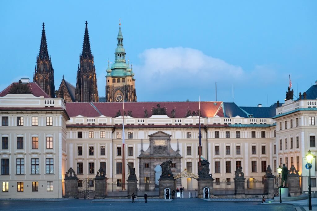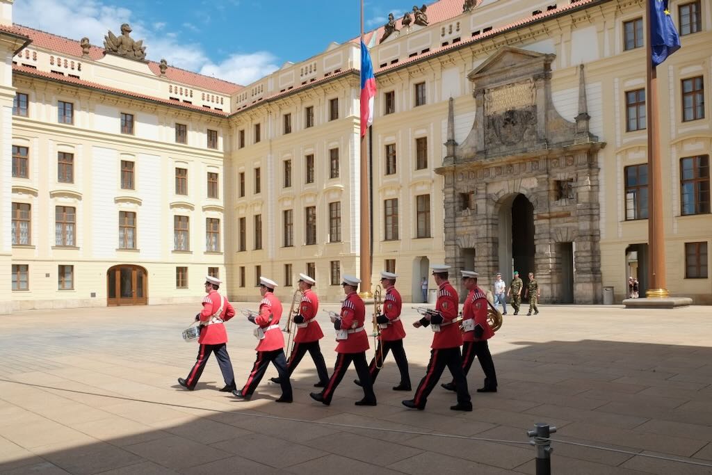 The First Courtyard of Prague Castle serves as the grand ceremonial entrance to the complex, bordered by the monumental Matthias Gate from the early 17th century.