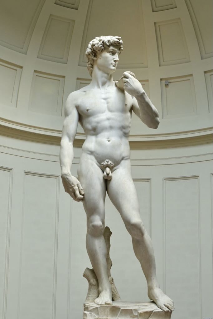 Michelangelo’s David, sculpted between 1501 and 1504 from a single block of marble, is a Renaissance masterpiece depicting the biblical hero David in poised contemplation before his battle with Goliath, celebrated for its detailed anatomy and embodying ideals of human beauty and strength.